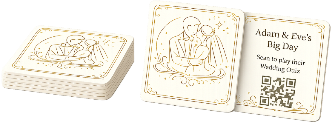 Give your guests a unique way to fill those moments, through beautiful printed coasters that unlock puzzles and games built entirely around you The Happy Couple
